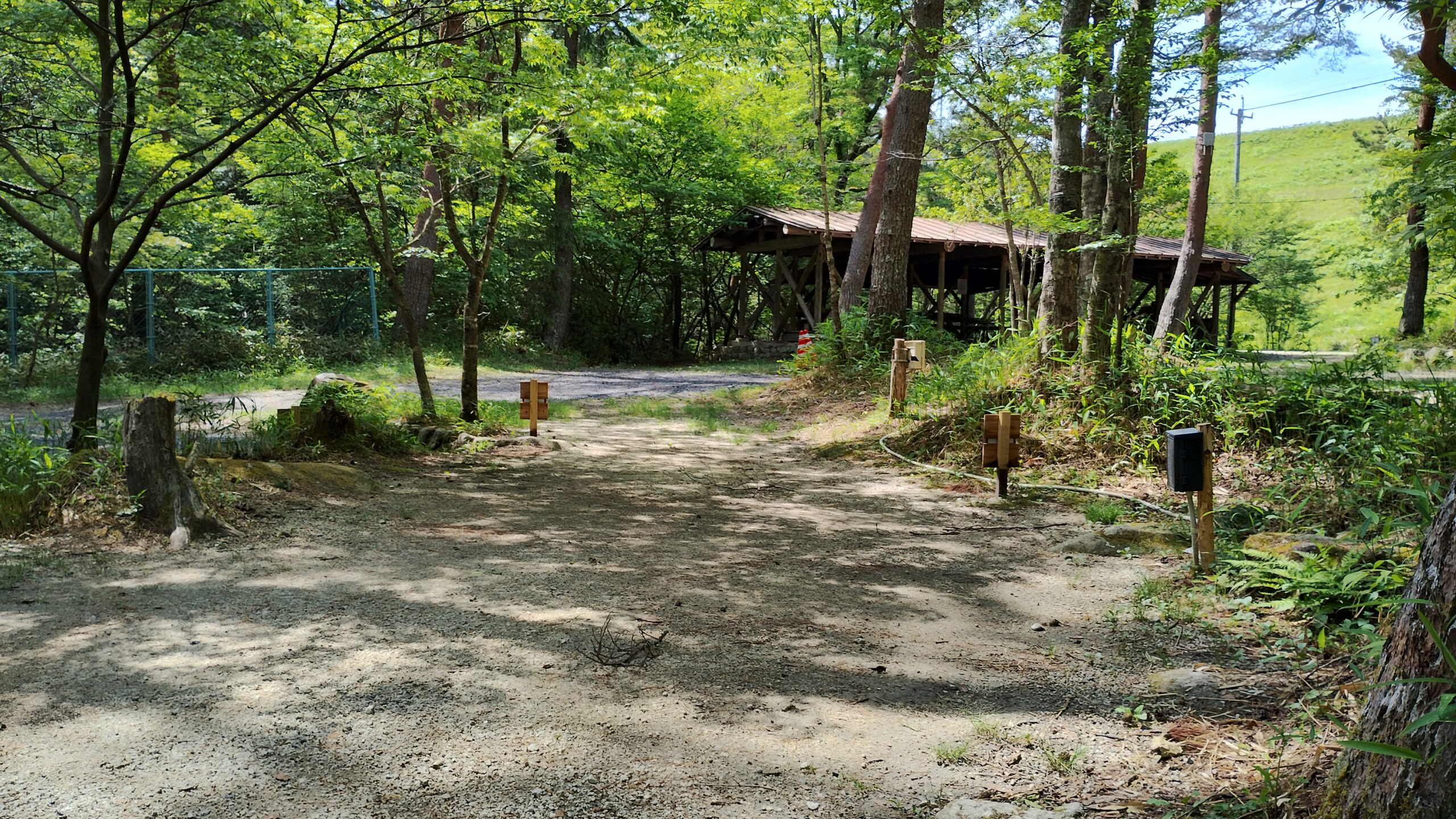 一段高い場所にキャンプエリアが設置されています。木々に囲われており、秘密基地感のあるサイトです。駐車スペースが道路を挟んだ反対側にあります。