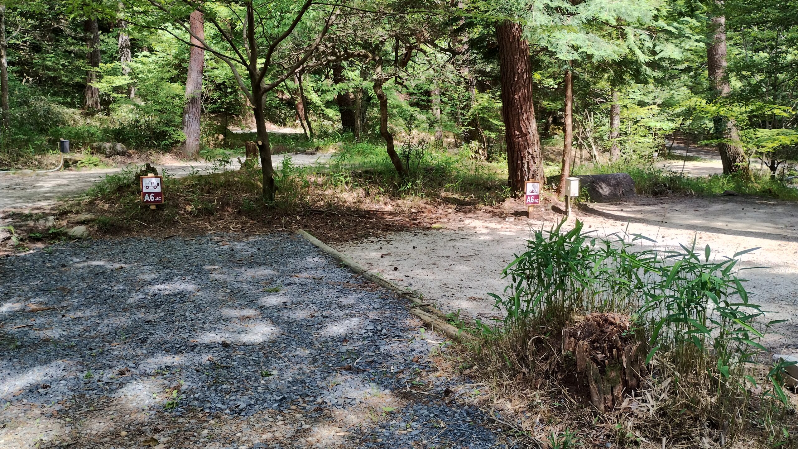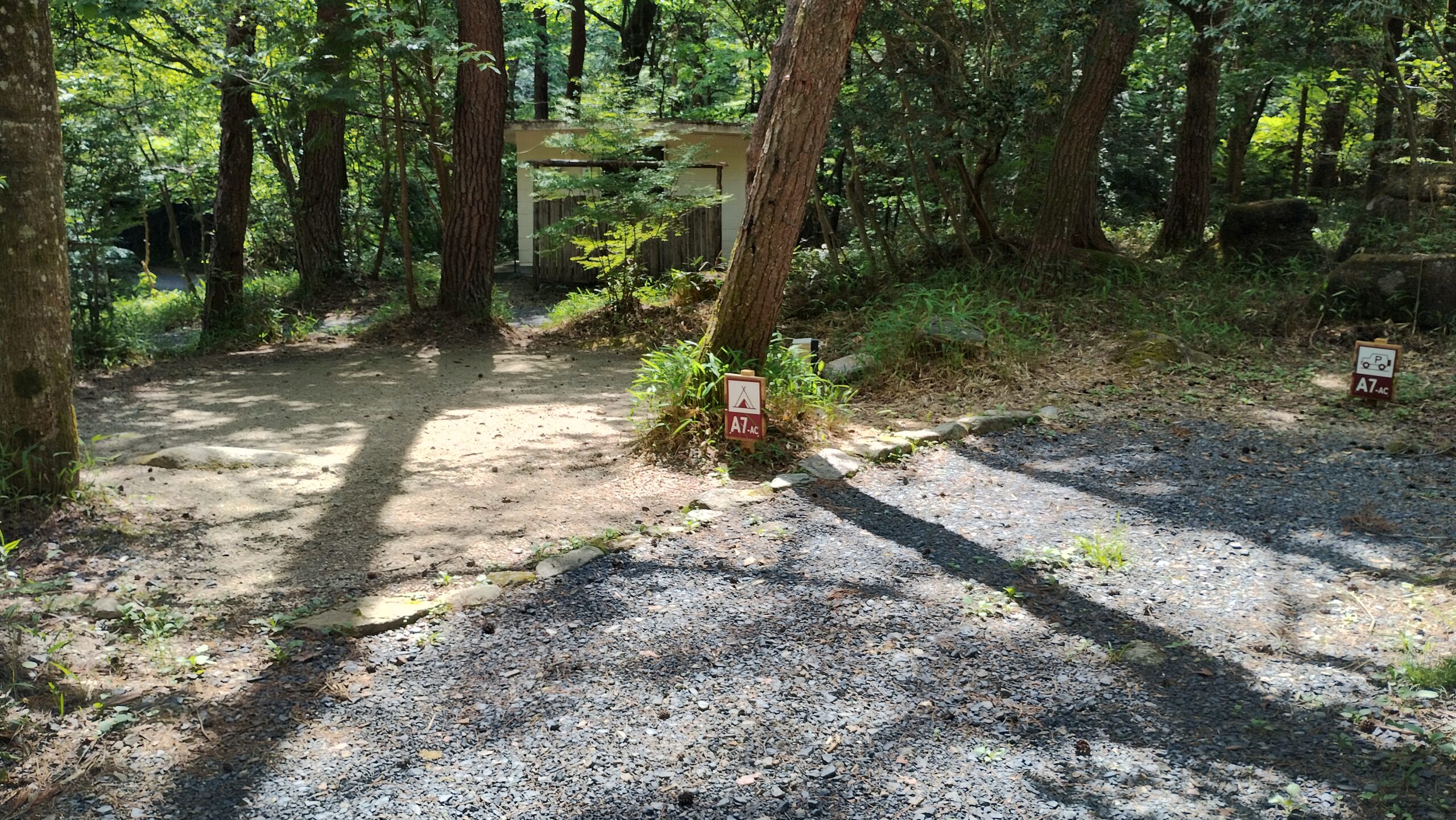 こじんまりとしたサイト。高い木々に囲われているので適度な明るさと木陰があります。お手洗いも近い、駐車も比較的しやすいサイトです。