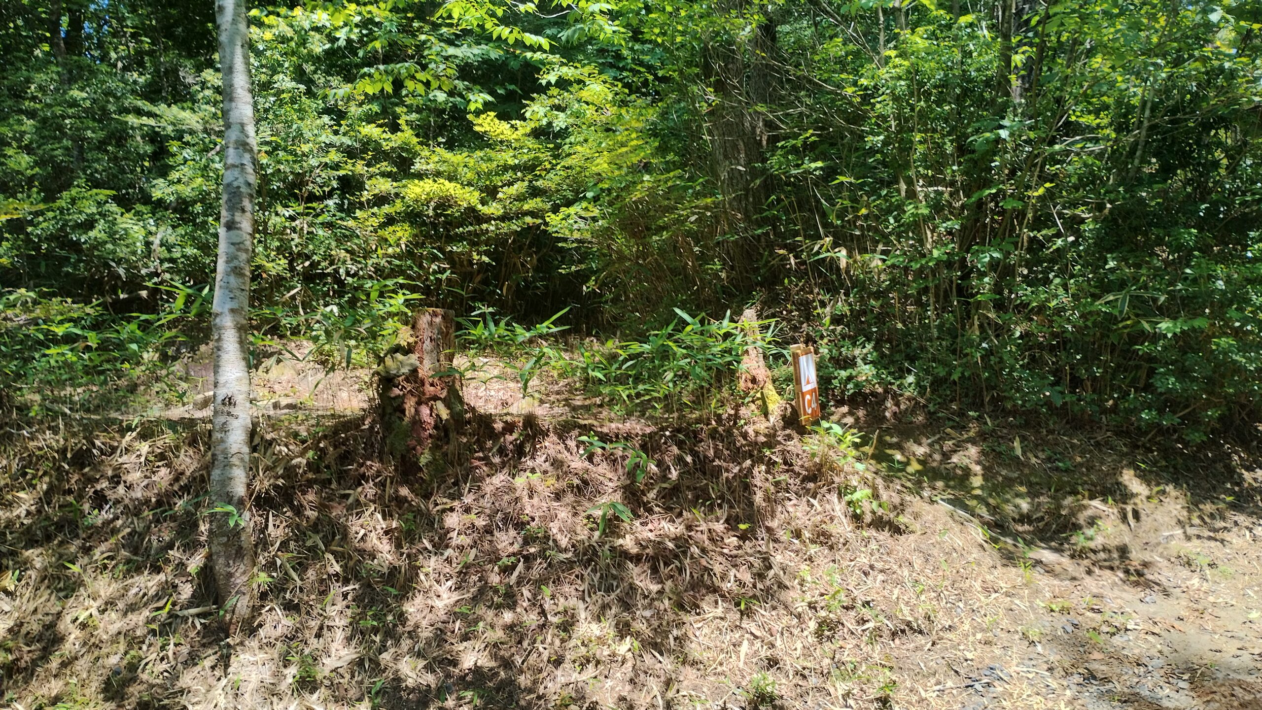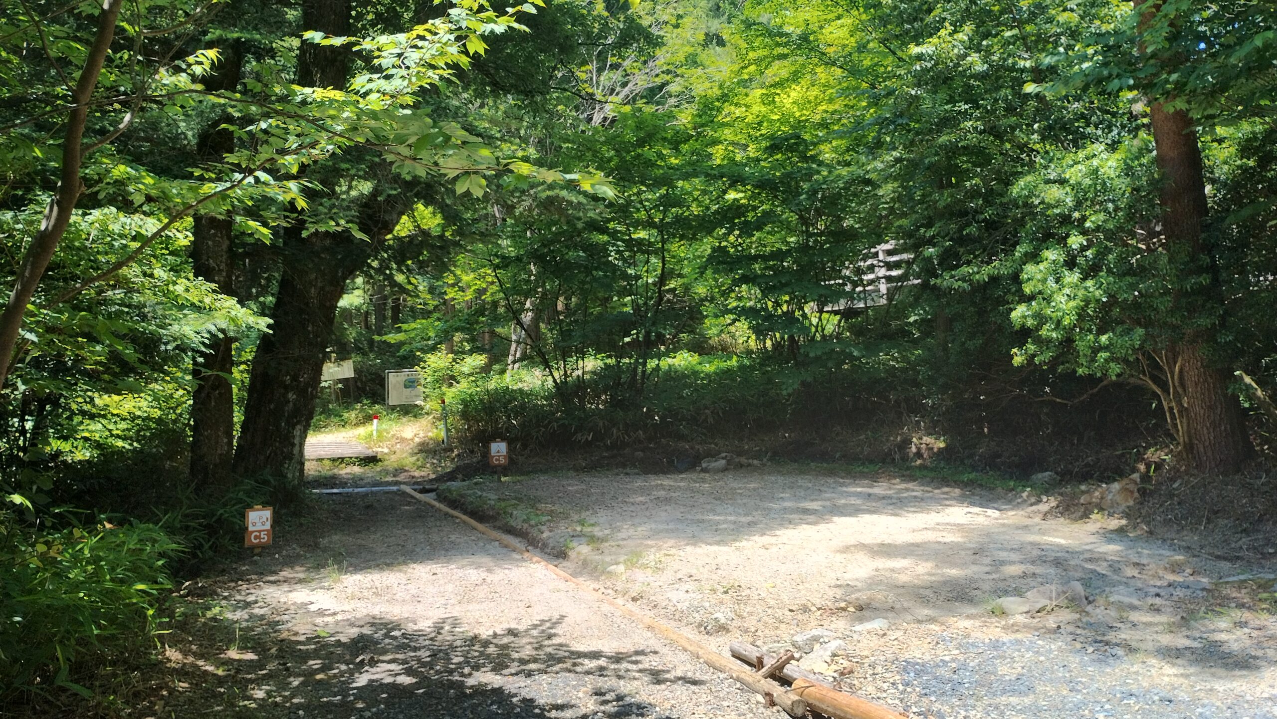 通路を挟んで駐車スペースとキャンプスペースを設置。木陰が多めのサイトになります。急斜面にあるので駐車の際は注意が必要です。