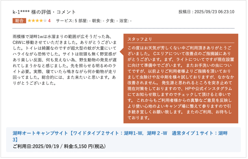 口コミへの返信の通り、解決に向けて現在も対策を実施中ではございますので
